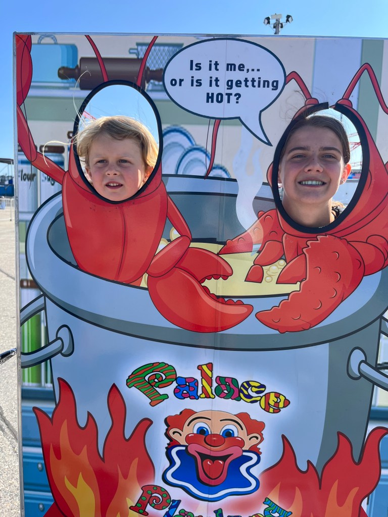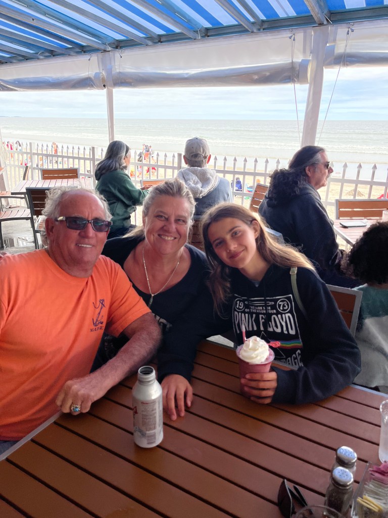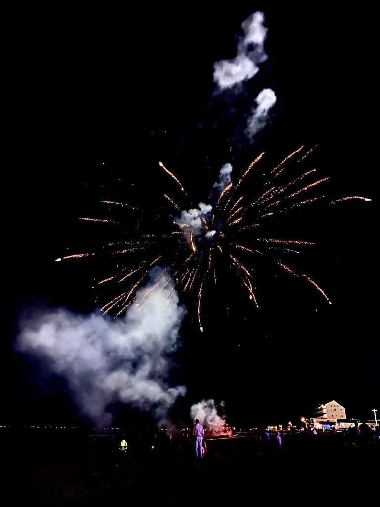 Another day we headed to Orchard beach to celebrate Elijah’s birthday. It’s basically a huge boardwalk that has a permanent carnival set up. We all got wristbands so we could ride unlimited rides. My papa even went on some with us kids. After riding majority of the rides I started feeling really sick and needed to eat. We walked over to a nice restaurant along the water. As soon as we arrived I ran straight to the bathroom to vomit. After throwing up I felt so much better and was ready for some dinner…. I guess I rode too many spinning rides in a row. After dinner we headed back to meet up with Tom, Delmara and the kids to ride more rides. Since it was getting late my parents headed back to take Landon to bed, but I got to stay with Tom and Delmara to watch the fireworks. I would say they were one of the best firework shows I’ve ever seen. It made it even better because we sat on the beach and watched them explode over the ocean.