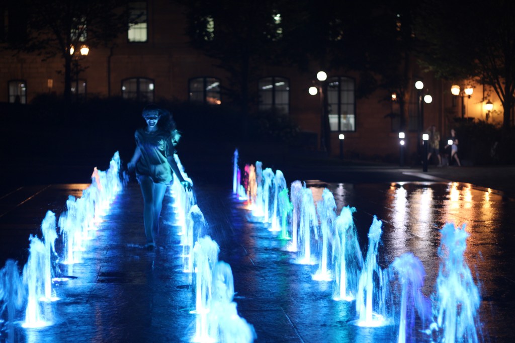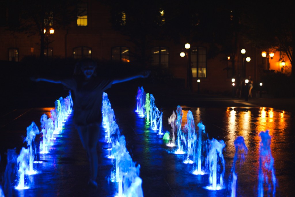 After lots of exploring we found a restaurant where we ordered all the local delicacies. We tried rabbit wings, pea soup, French onion soup and meat pies. For dessert we ordered the poor mans pudding and it was buzzin buzzin! The restaurant was really cool as well, it had a downstairs with lots of individual toilet rooms and in the middle was an old claw foot bathtub they used as a sink. They even had a tiny Volkswagen bug in the entrance. Once we were done eating dinner we started making our way back to the car but stopped at these really cool water fountains that I decided would be the perfect spot for a photo shoot.