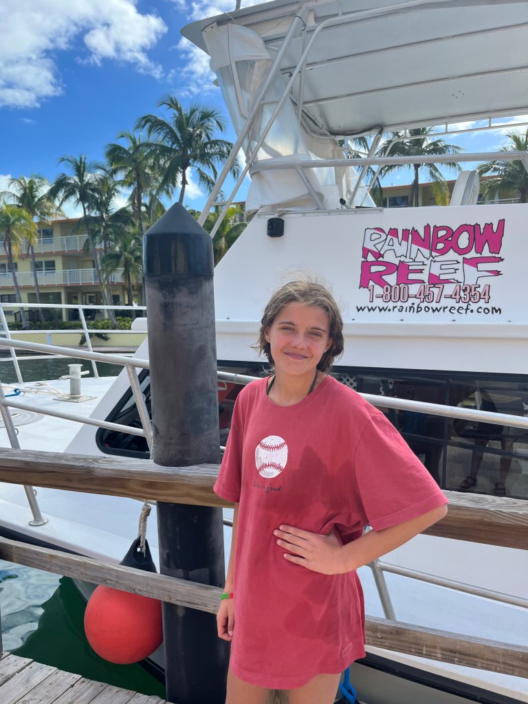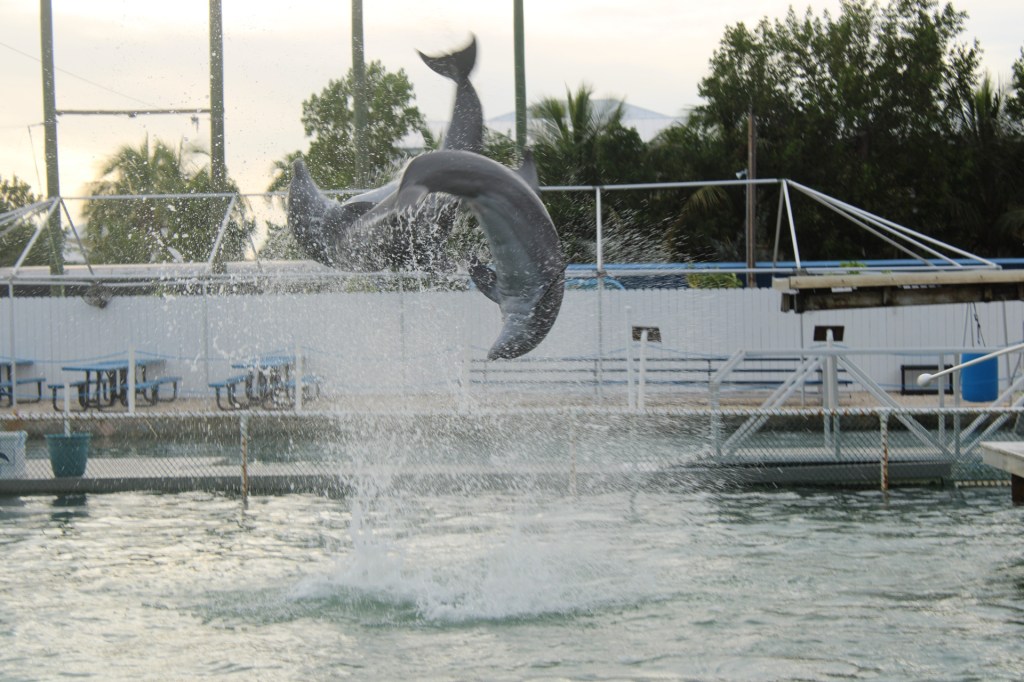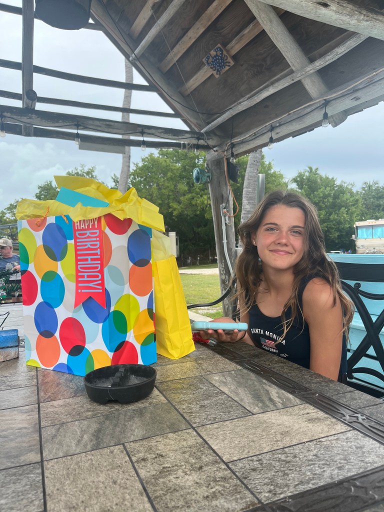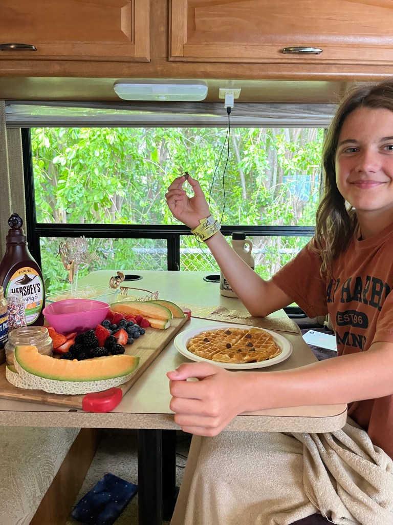 The next morning I woke up super excited to the RV all decked out in decorations for my 13th birthday! Since I really wanted waffles for breakfast, my mom bought a waffle maker and made me yummy waffles with homemade whipped cream, berries, sprinkles, chocolate, and of course candles to blow out. After breakfast I got ready for the day then hung out at the tiki bar. To my surprise, all the other campers started gathering around for a surprise birthday celebration. They sang me happy birthday, ate cake and even got me presents. It was so sweet of them to do that since I had just met everyone a few days prior. Unfortunately we had to end the celebration early because I was going to go swim with dolphins at the dolphin’s rescue.