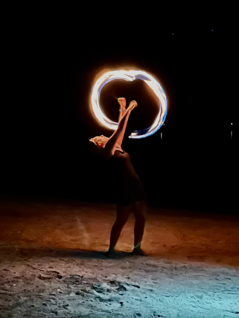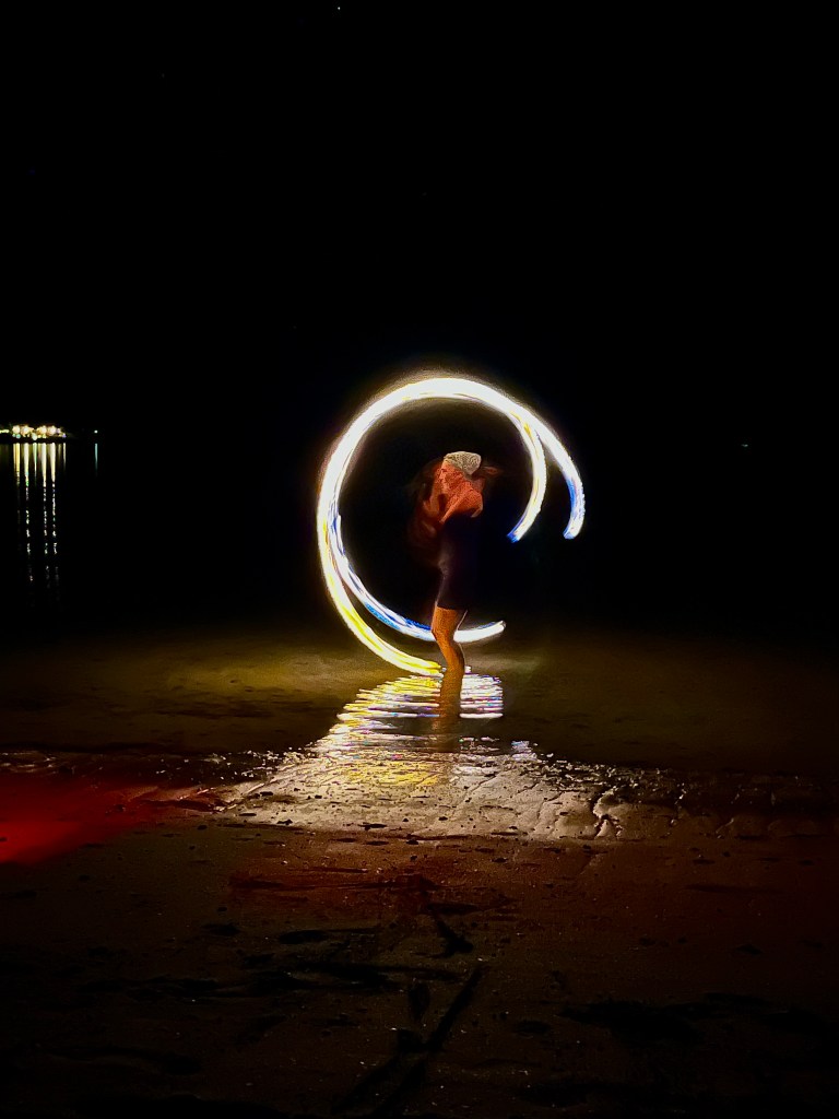 We spent every day on the beach with our Friends but my favorite day there was when we celebrated my birthday. In the evening us and two other families went to the restaurant to have dinner, since there were so many of us we split up and did a kids table and an adult table. We had lots of yummy food before heading back to the RV where we all hung out around the campfire. My mom made homemade sourdough brownies and everyone sang happy birthday to me. Shortly after we seen two amazing things. The first one, one of our neighbors was doing fire spinning show that was outstanding. I got my camera out and got to practice some night photography of the show. The second thing was mind blowing, we noticed the water was shimmering so we took the paddle boards out to see the bio luminescence! It was so amazing, like a fairy tale brought to life. Each time you would move the paddle the whole water would light up with a shimmery blue glow. Off in the distance a boat was driving back and forth with their lights off where you could see their whole wake light up. It was stunning and such a great birthday treat.