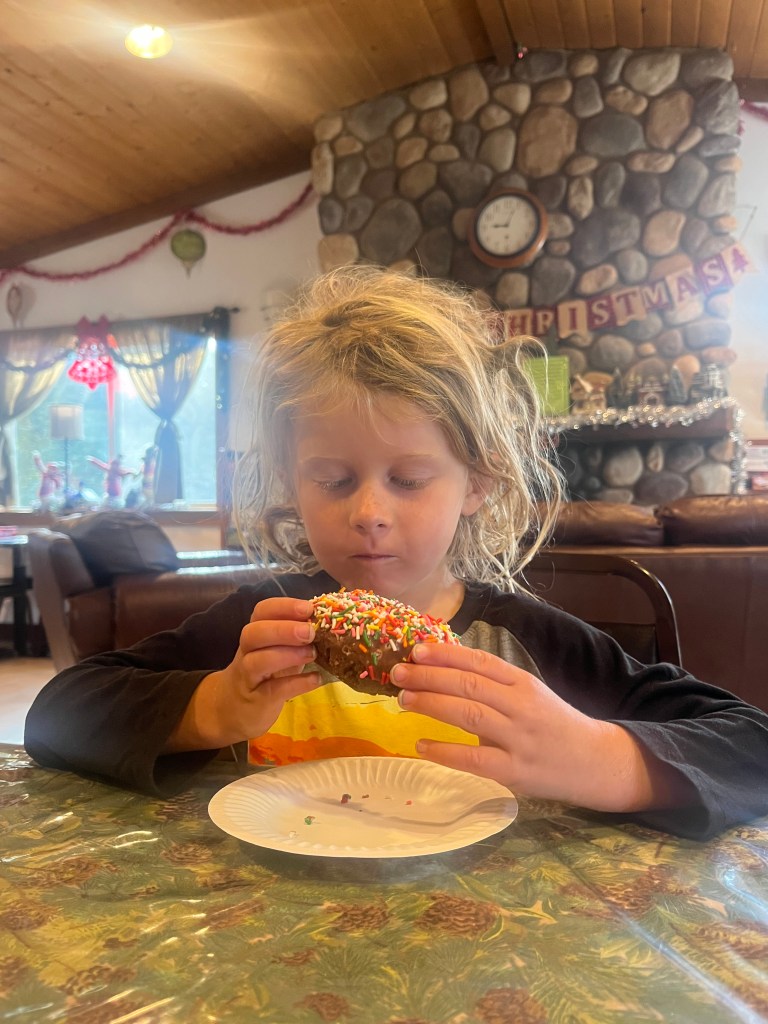 The following day we got up a little earlier because the lodge had a full schedule of activities planned. After getting ready, both families walked over for a yummy breakfast. Donuts and coffee were the perfect start to the day. Later, my friends and I painted our nails while watching a show. In the afternoon, we joined in on the lodge activities. First, we painted rocks. I decorated three: one with a sunset, one with an ocean, and one with a desert and a saguaro cactus. While they dried, we made snowmen out of candy. The activities were super fun and I’m glad they offered them. I think Landon especially enjoyed making and eating his snowman. To end the day, we went to the hot tub. It felt amazing since it was cold outside and the water was super warm. While we were at the pool area, we also did a polar plunge. It was freezing! It honestly felt like tiny knives stabbing into your skin the moment you jumped in!