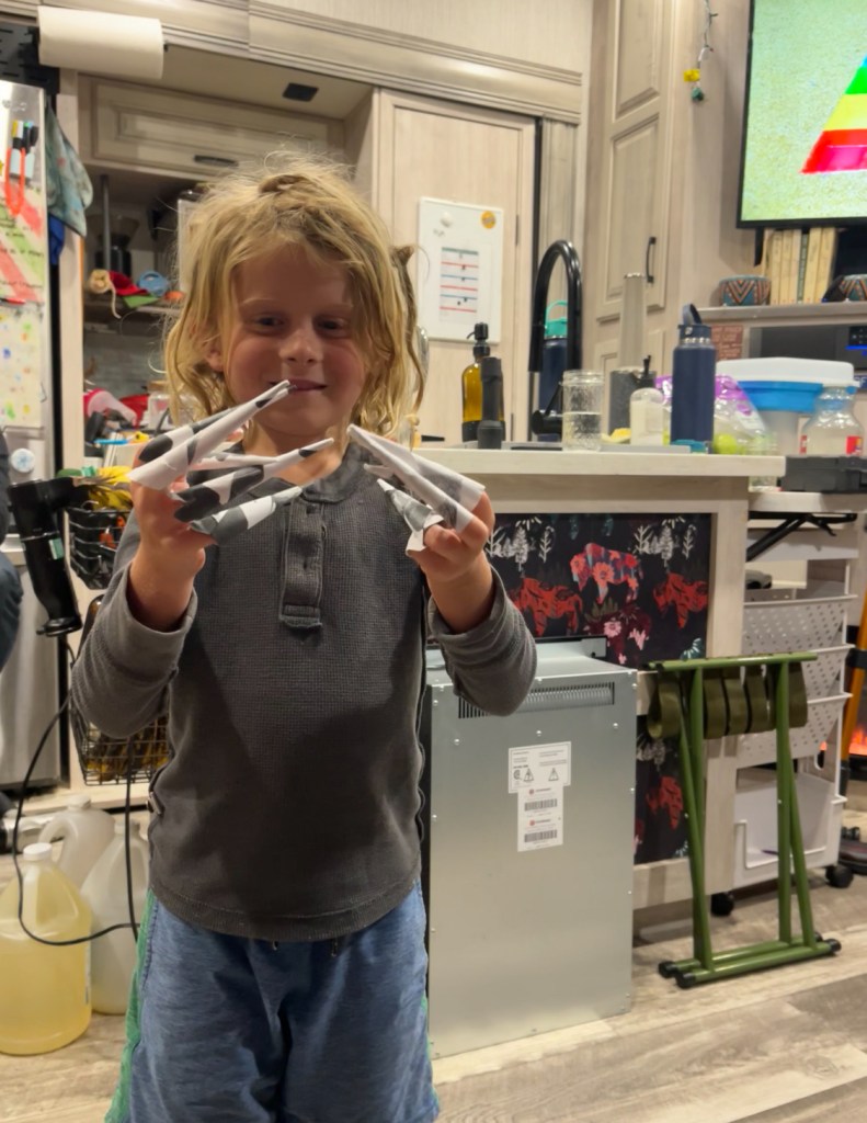 The next morning, my mom and I headed out to run some much-needed errands. First, we stopped at the pet store to grab dog food and a new bed for Blue. His old one was full of Baja sand, lol. After that, we went to Costco, visited two other grocery stores, and finished the trip with a stop for açaí bowls. When we returned, we put the groceries away and did a reset on the RV. I washed the dishes, cleaned out our cooler, swept the floor, and helped my mom with laundry. After finishing chores, Landon and I went to the park and played tetherball with our friends. That evening, the adults made homemade pizzas that looked absolutely delicious! While we waited, my friends and I sang karaoke, played cards, and watched some shows. After a few hours of fun, we headed back to the trailer for some much-needed rest.
